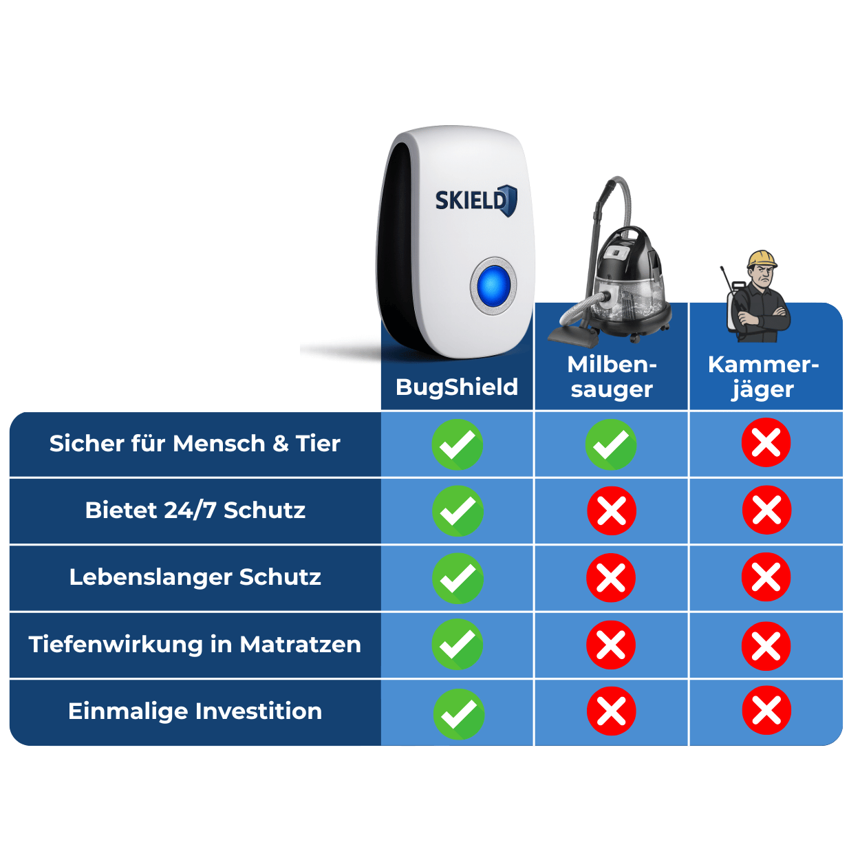 BugShield wehrt nicht nur bestehende Milben ab, sondern hilft auch, neuen Befall zu verhindern, indem es eine unbewohnbare Umgebung für sie schafft. Durch die kontinuierliche Aussendung von Ultraschallwellen schützt es Ihren Raum 24/7 und erschwert es Milben, zurückzukehren oder sich auszubreiten. Um beste Ergebnisse zu erzielen, lassen Sie BugShield immer angeschlossen und verwenden Sie es in mehreren Räumen, um eine vollständige Abdeckung zu gewährleisten.